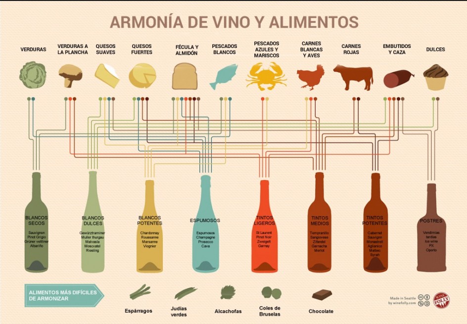 Independientemente de armonías basadas en tareas de investigación como la que realizan los hermanos Roca en El Celler y que les mostramos en el vídeo que pueden ver más abajo, puede servir de ayuda el apoyarse en los consejos básicos que, como en el gráfico de cabecera que hemos traducido para ustedes, se han seguido tradicionalmente. Pero no piensen que son verdades absolutas. En realidad, a la hora de escoger el vino, hay varias características fundamentales a tener en cuenta más allá de la clásica diferenciación entre vino tinto o blanco:
