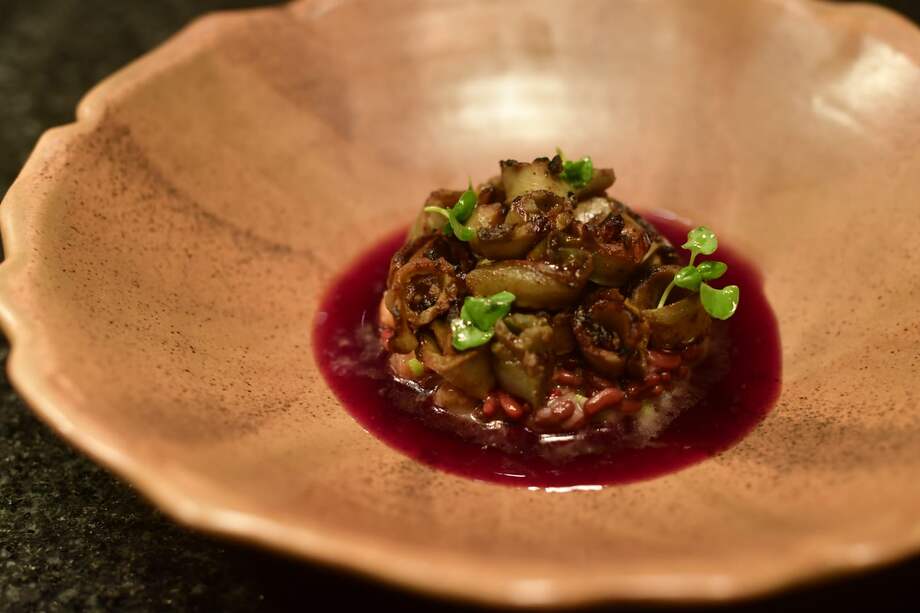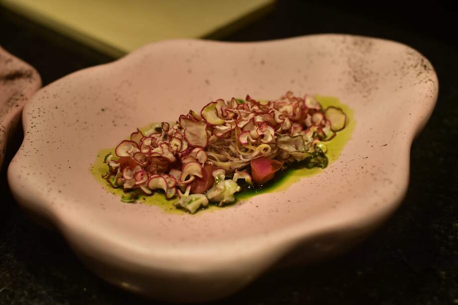 | Finzenú: calamar pota curado sobre seviche de frijol, cascabeles de plátano manzano, queso costeño frito y caldo de tamarindo y clitoria. Foto: Óscar Pérez |